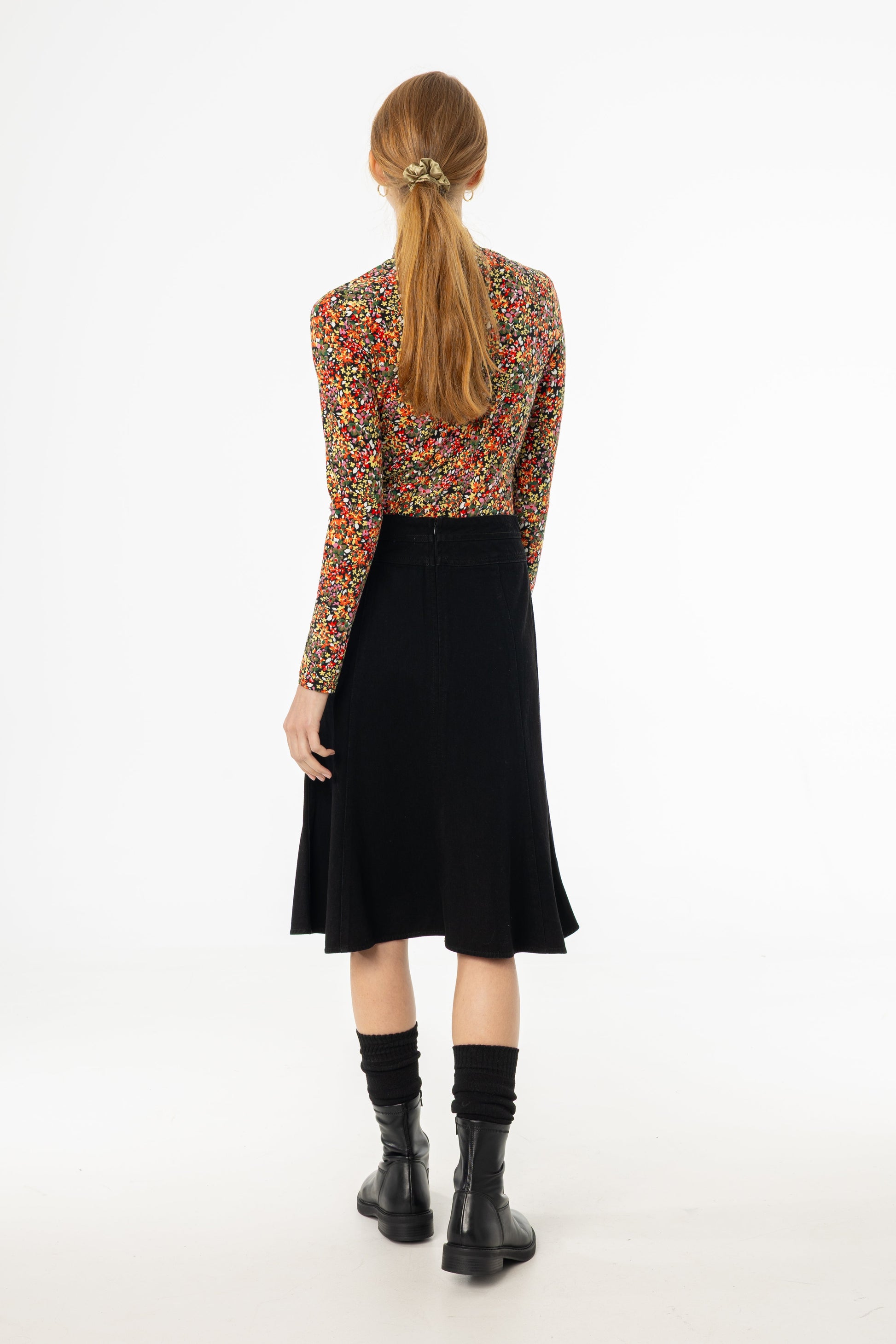 Soft flare creates gentle movement with every step. The knee length brings ease, making it an easy day-to-night choice. Pair it with a printed turtleneck or tucked-in sweater for cooler evenings.