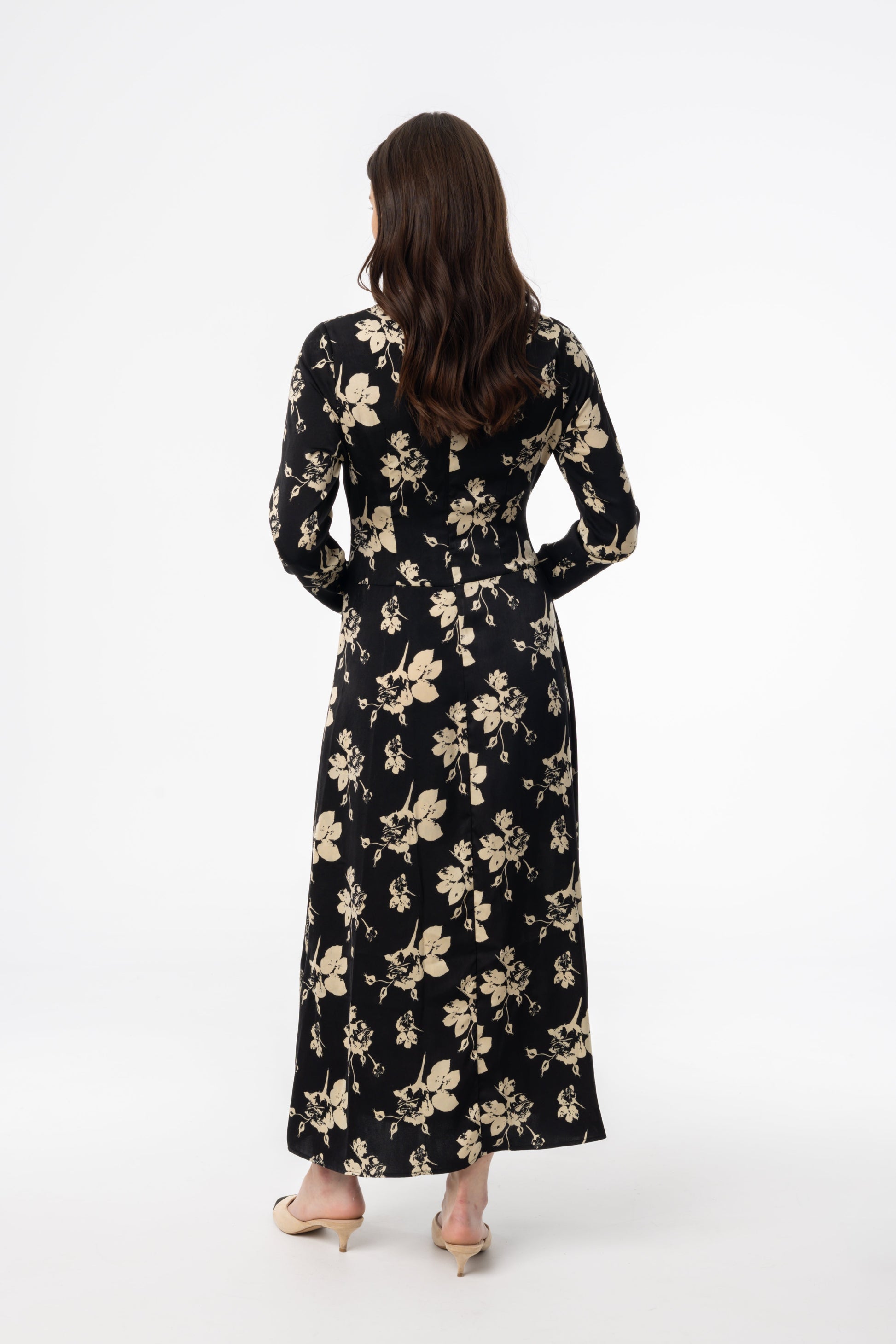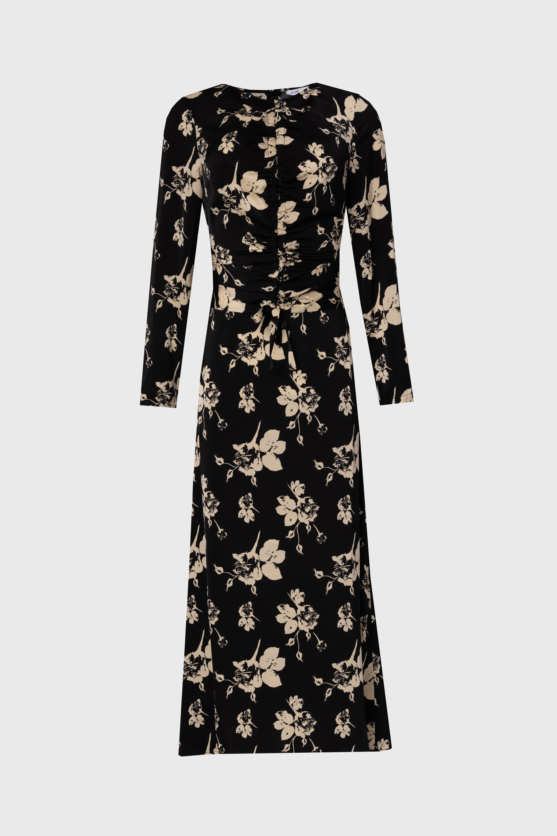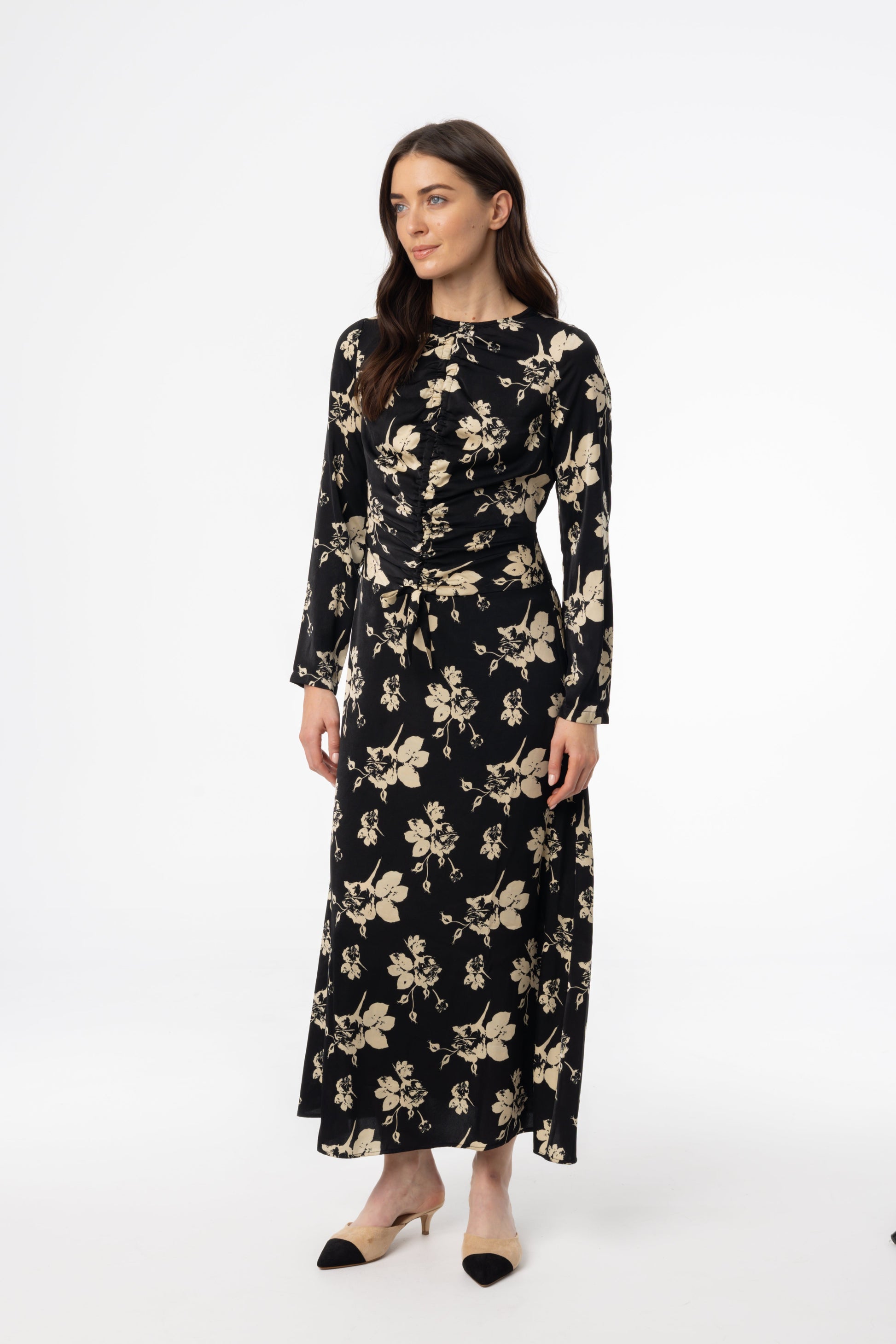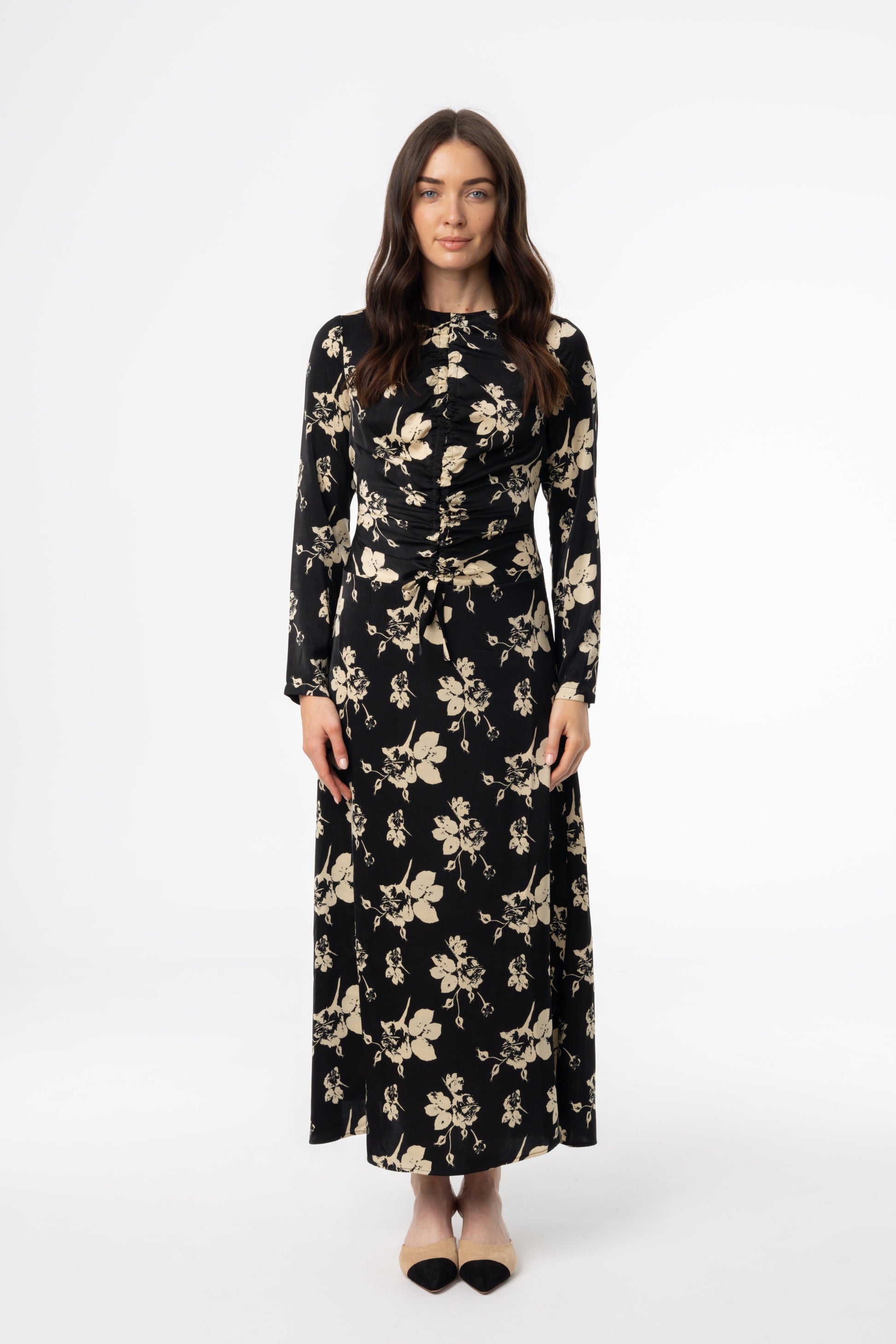 A dress that knows how to make an entrance. Black florals keep it timeless, ruching gives it that extra sculpted touch, and the maxi length makes every step feel like a moment. Wear it sleek with heels, or go for an effortless feel with flat sandals and a crossbody bag. Either way, this one does all the work—you just show up.