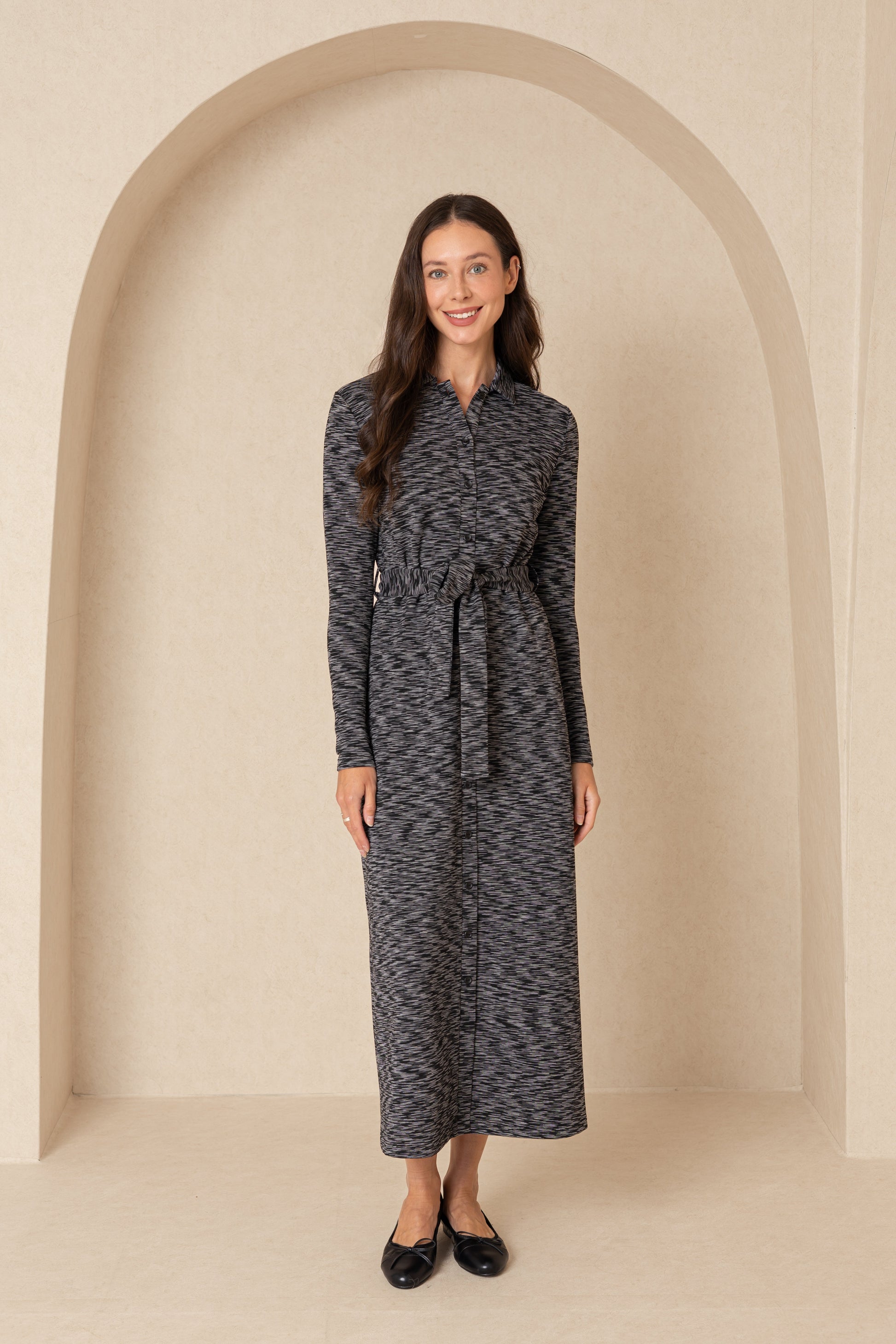 Elevate your cold-weather style with our Striped Maxi Dress, and get ready to turn heads! The Striped Maxi Dress takes your wardrobe to a whole new level. No more boring winter outfits with this stylish dress featuring a trendy button closure, figure-enhancing faux belt, and customizable fit with belt loops.