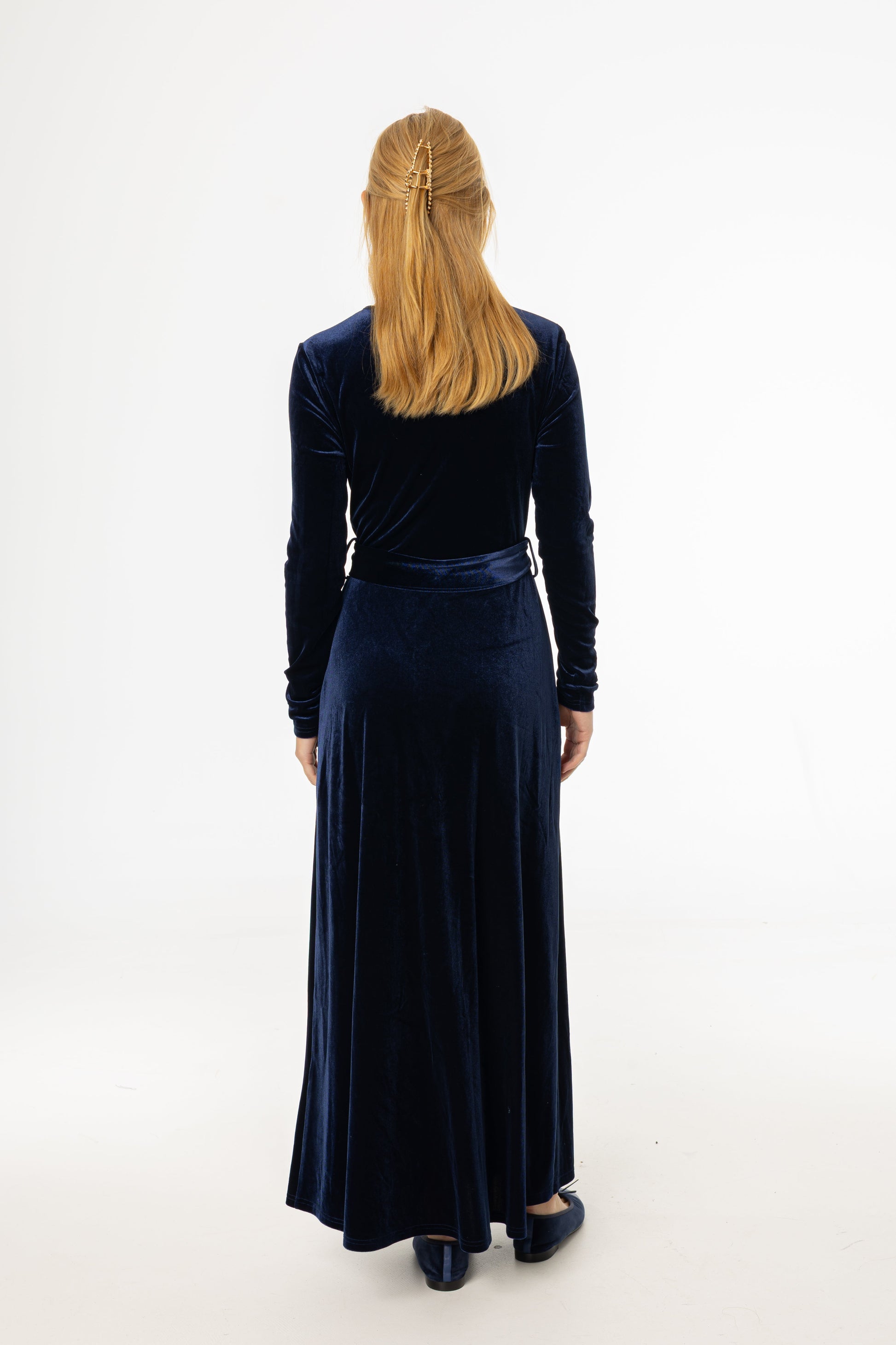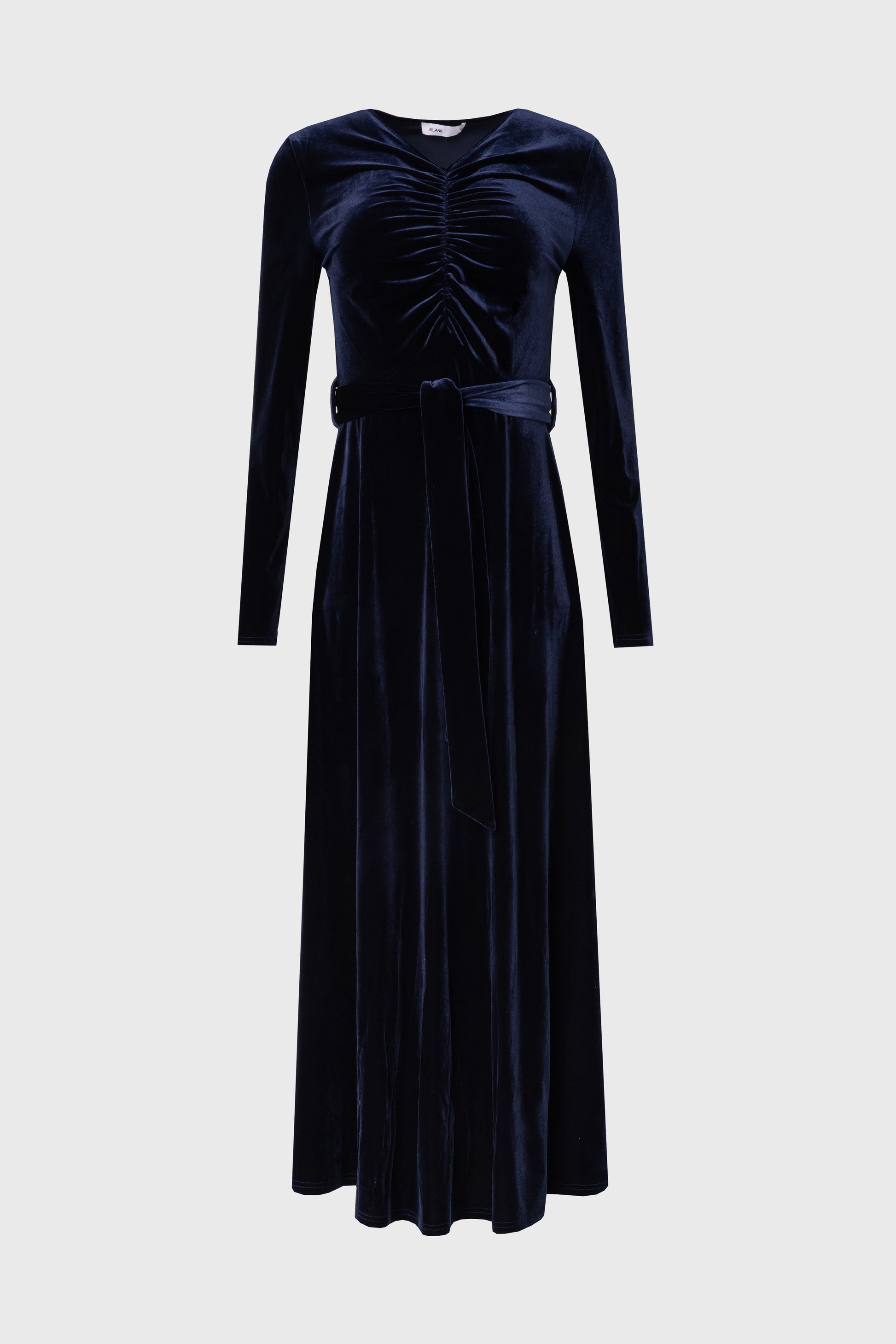 Navy Ruched Velour Maxi Dress