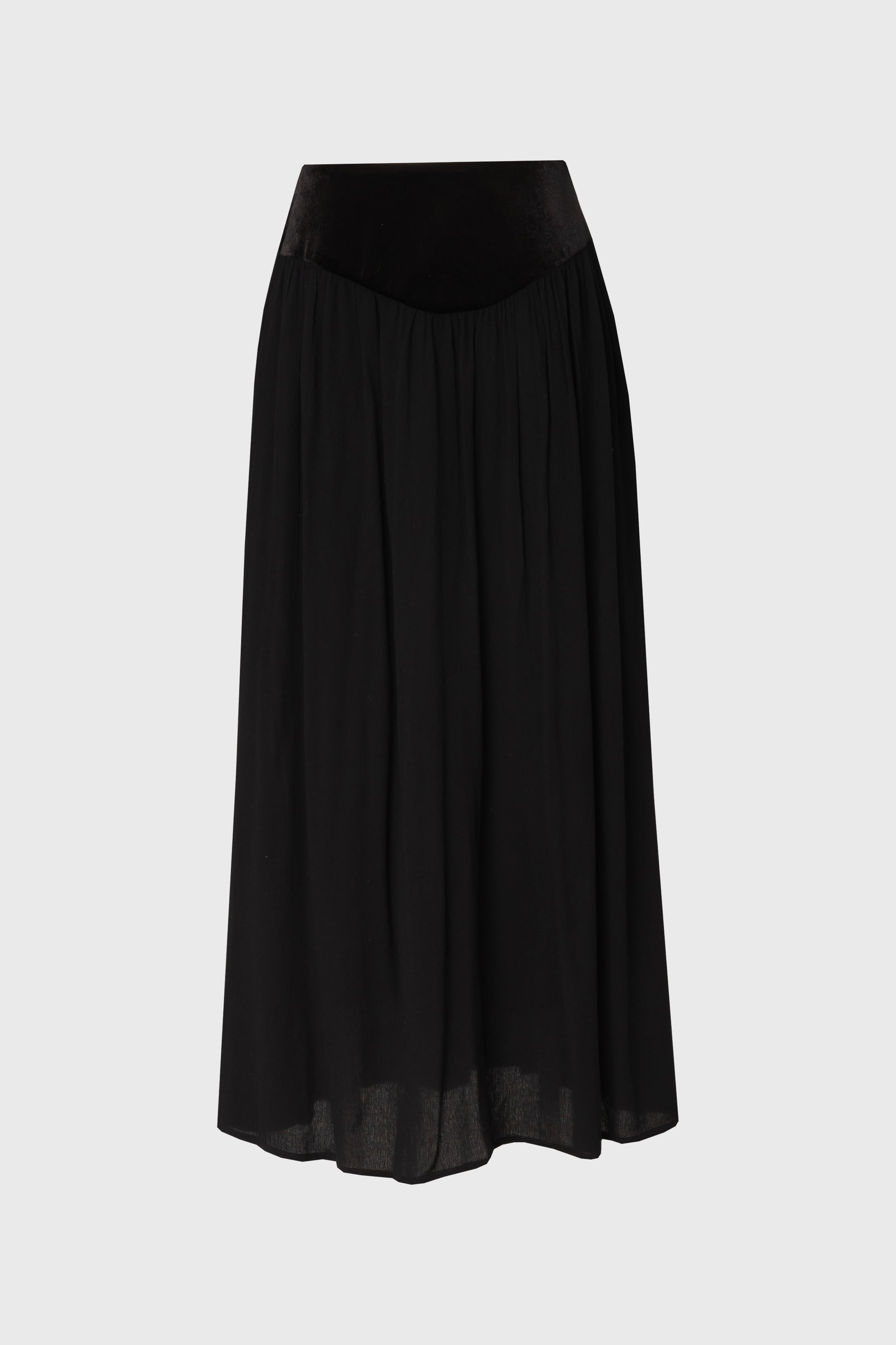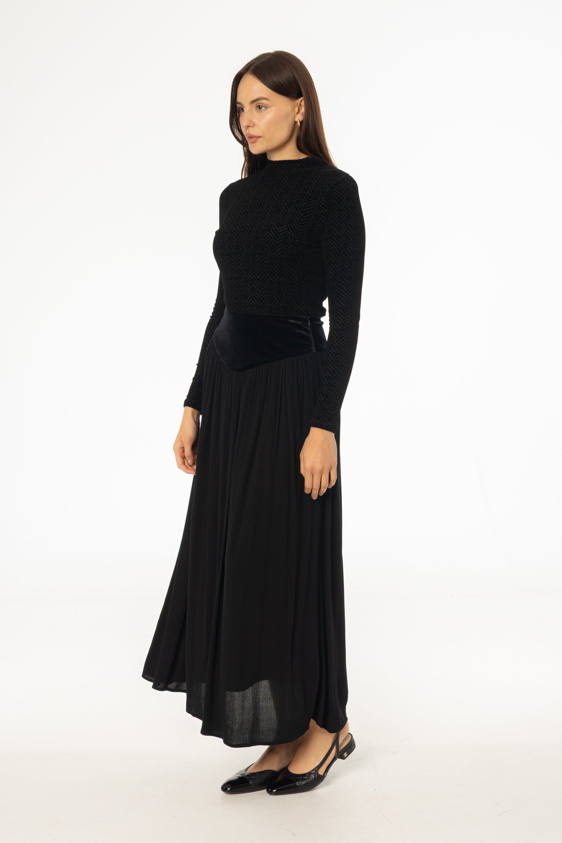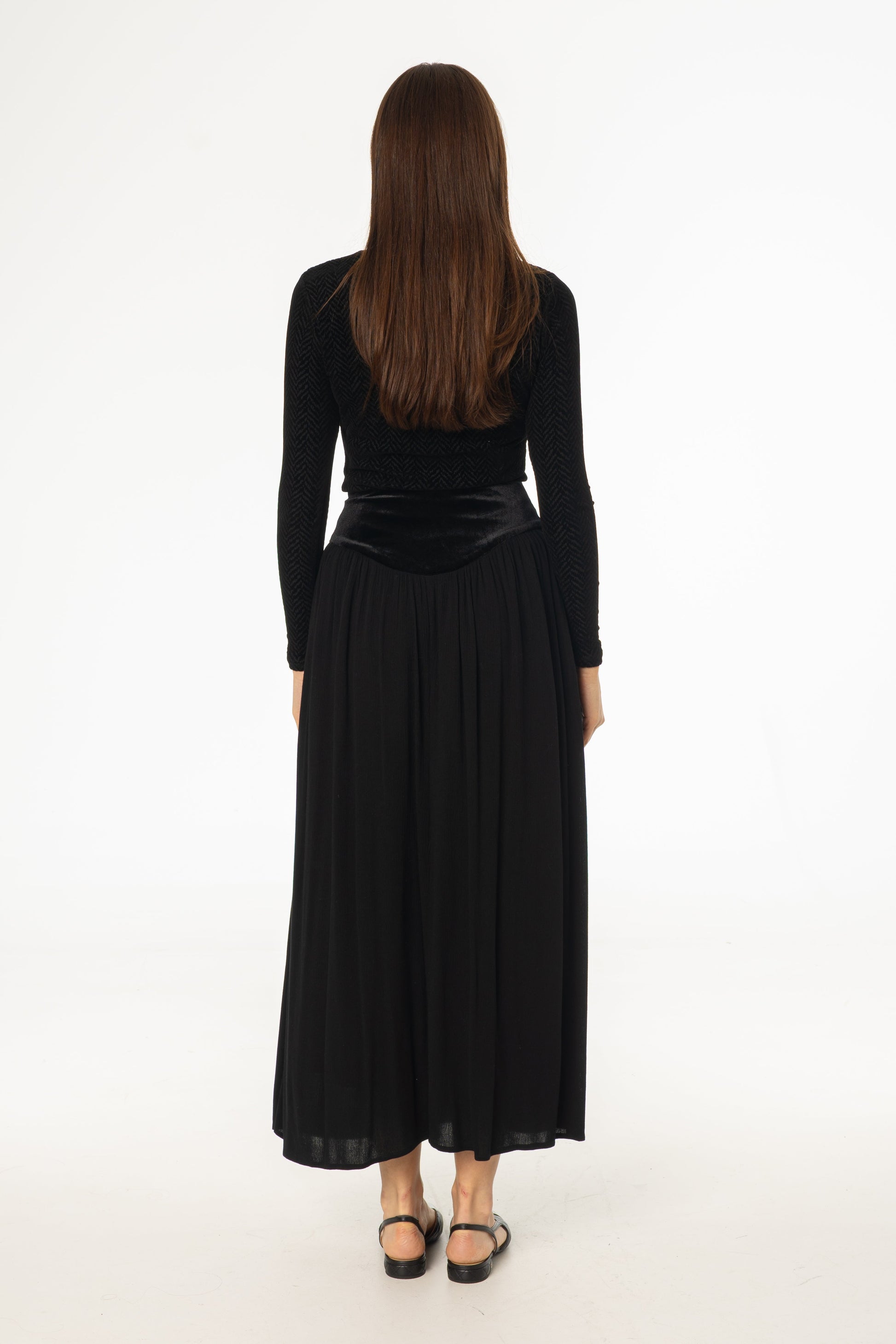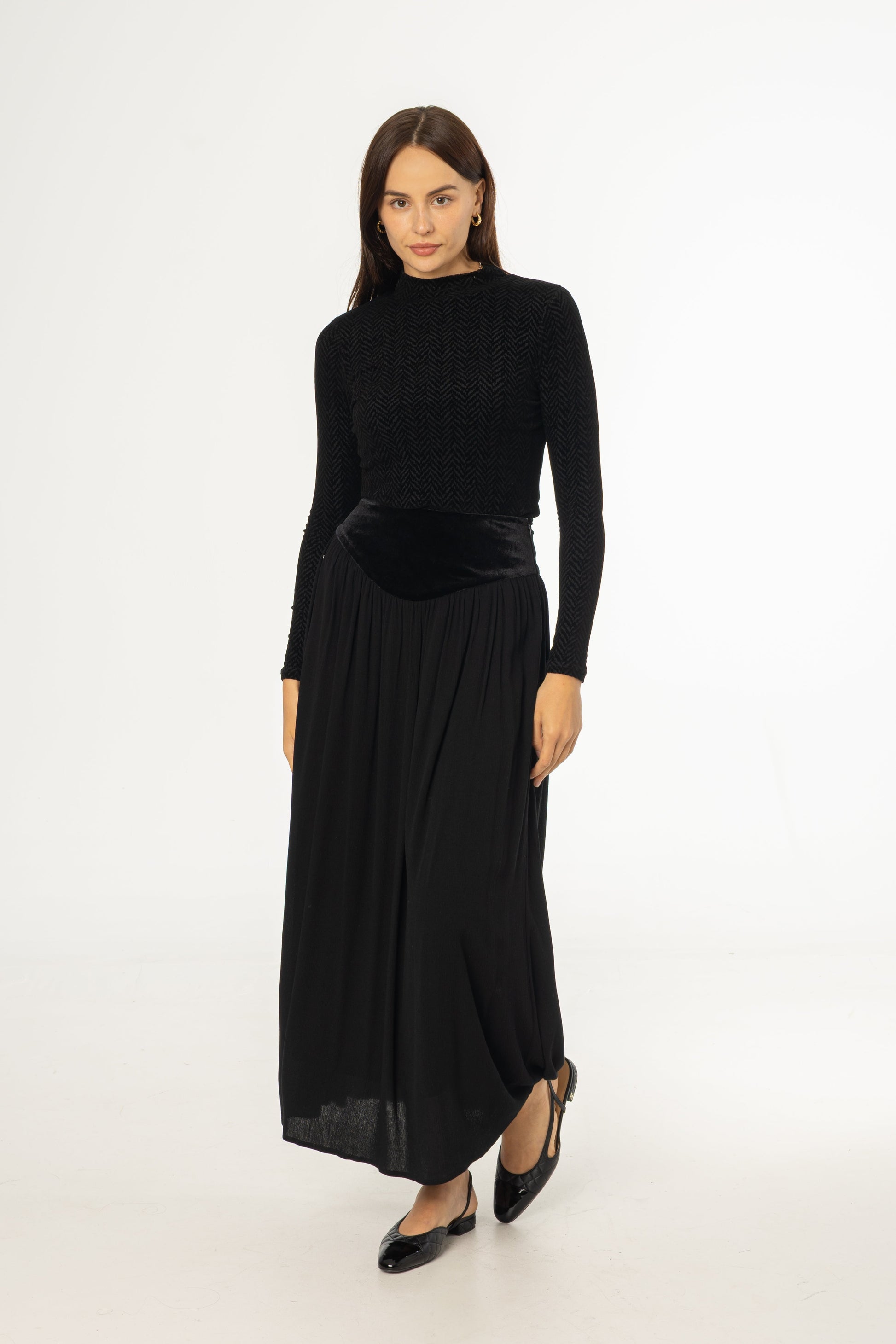 This maxi skirt blends textures, creating quiet interest while staying classic. Its length makes it perfect for pairing with fitted tops or tucked blouses. Style it with ankle boots and a structured jacket for the day, then switch to heels for the evening. The mix of fabrics gives it an edge without losing elegance. A fall foundation piece that adapts to every occasion.