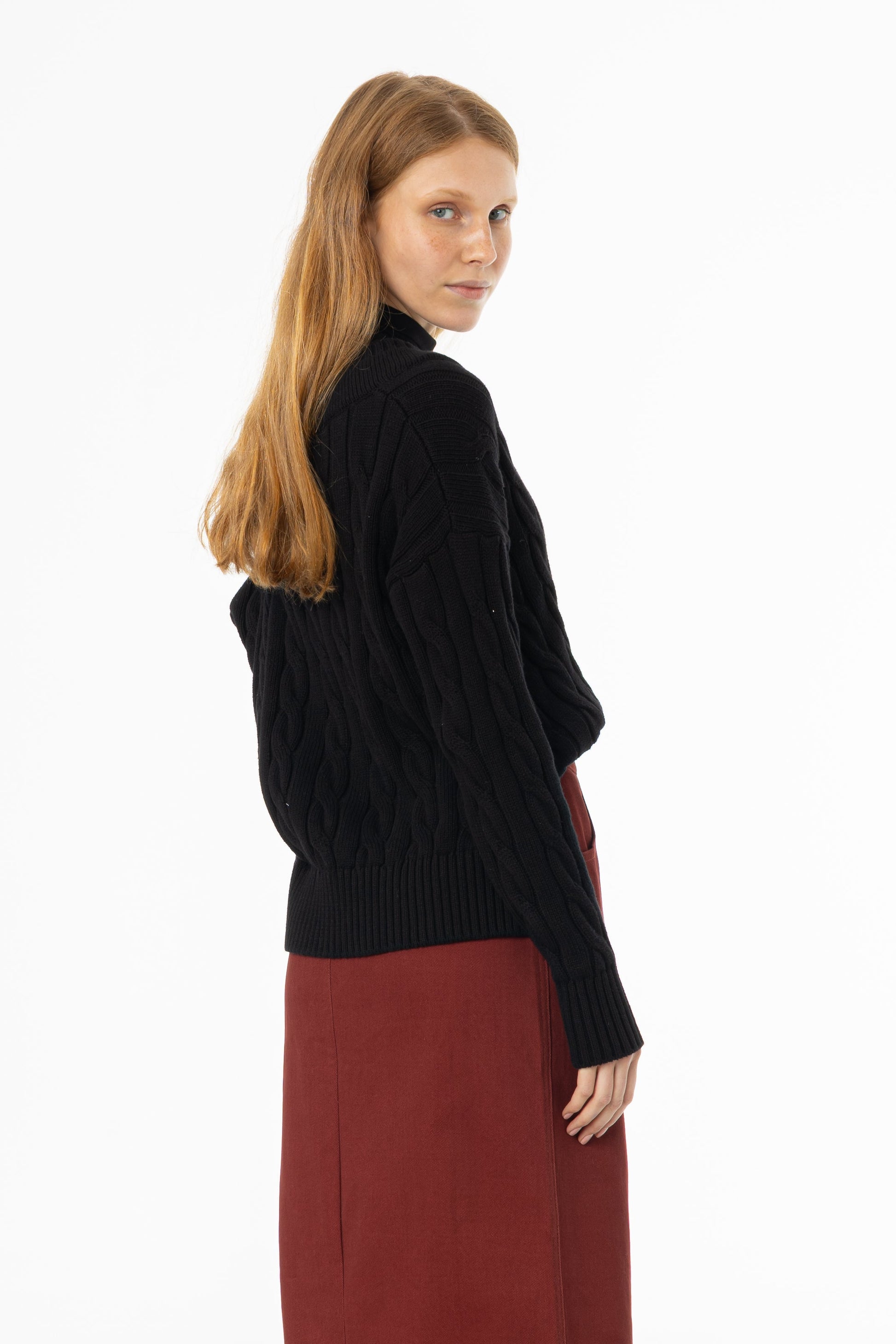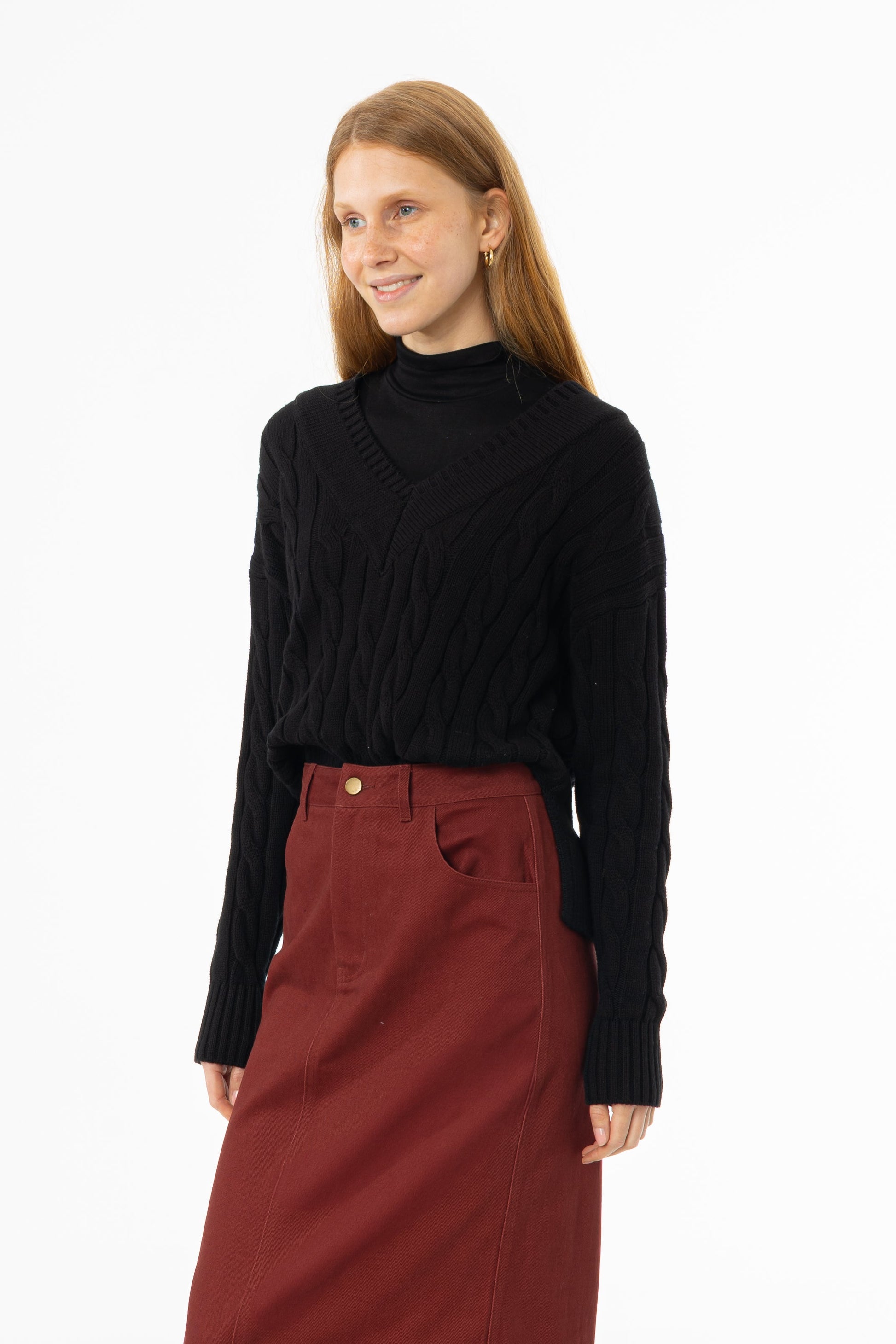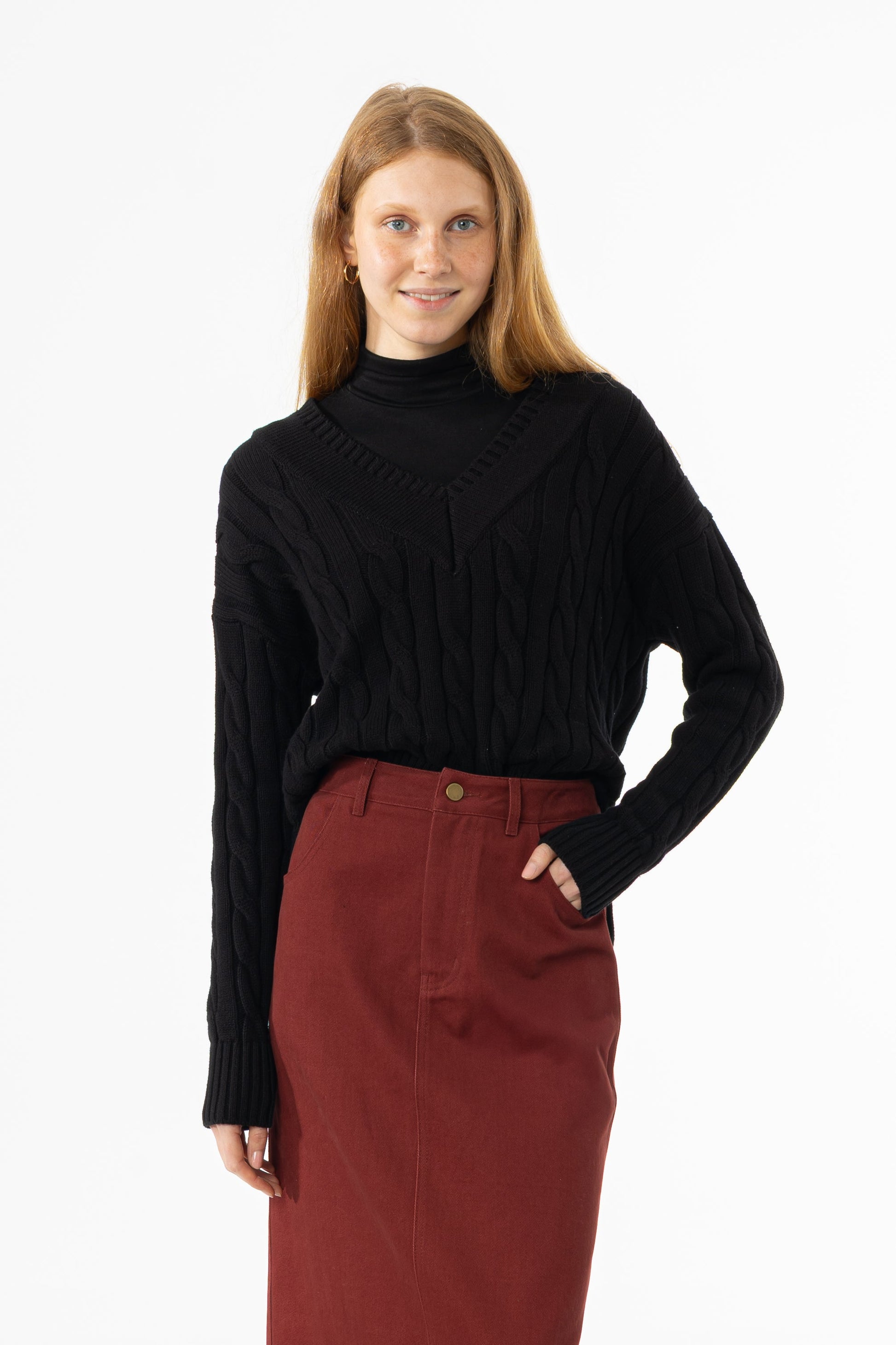 Your go-to sweater just got a little smarter. The deep V-neck keeps it classic, while the chunky cable knit brings that cozy fall texture we all crave. It’s the kind of piece you’ll want on repeat from coffee runs to crisp evening strolls. Slip it on and it instantly feels like fall is here. Style it with a turtleneck top tucked into a denim skirt with boots for an easy, put-together look.
