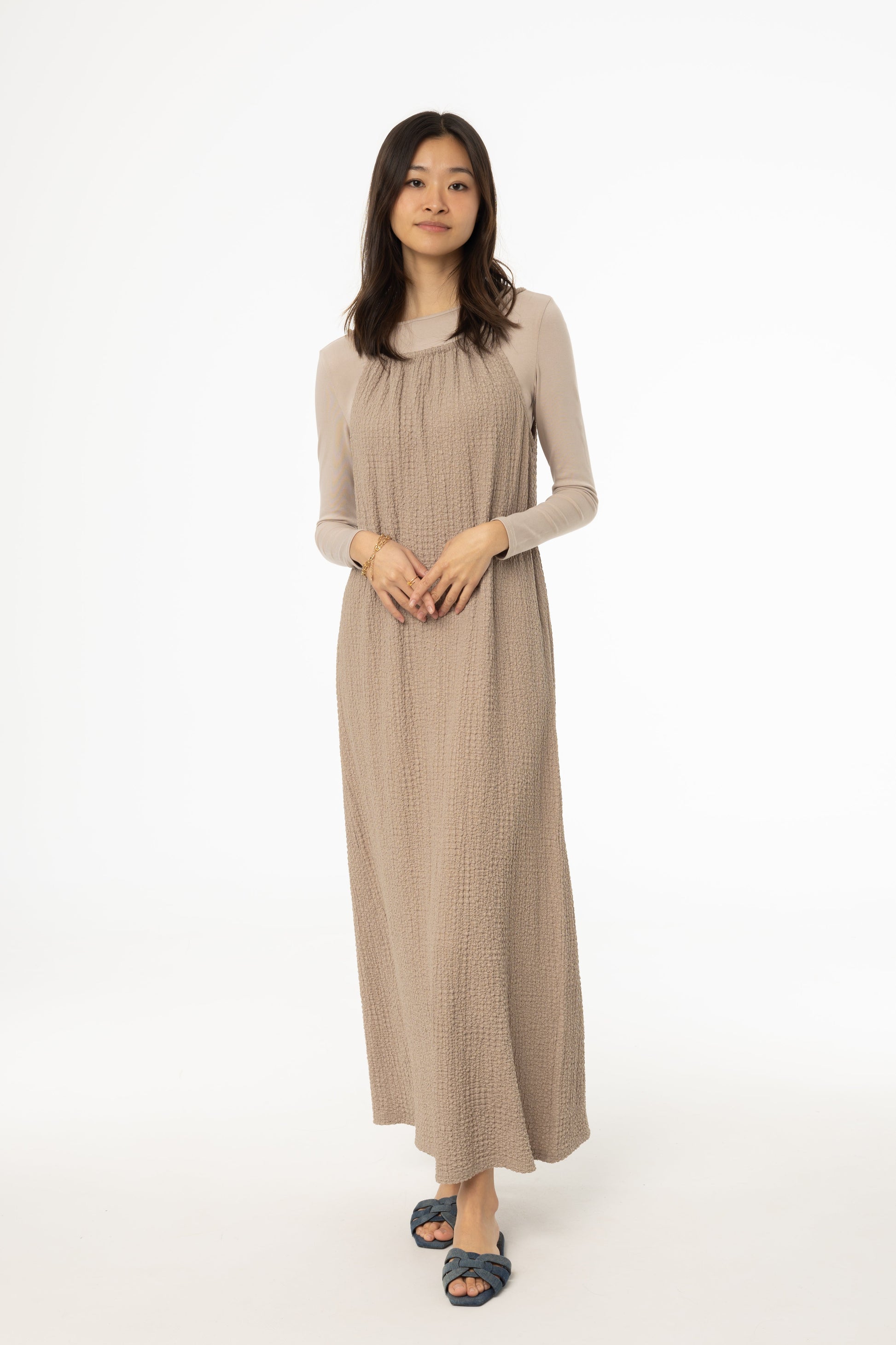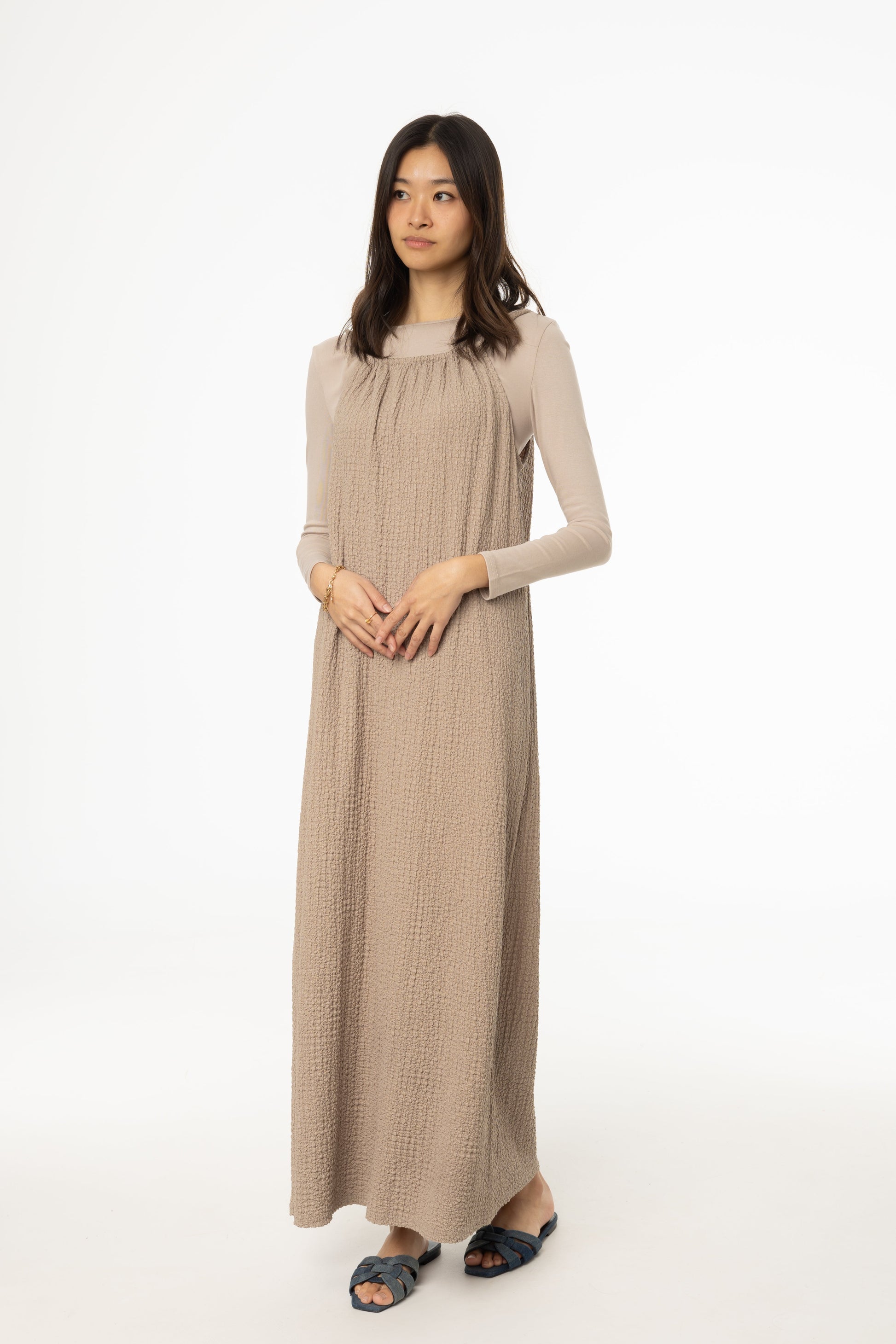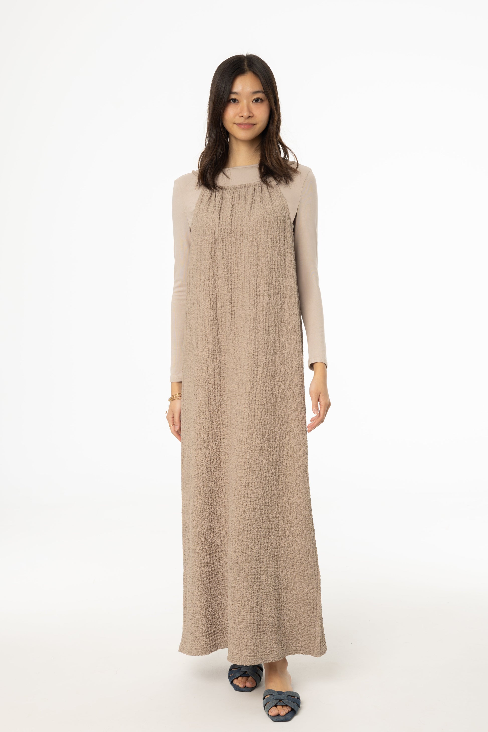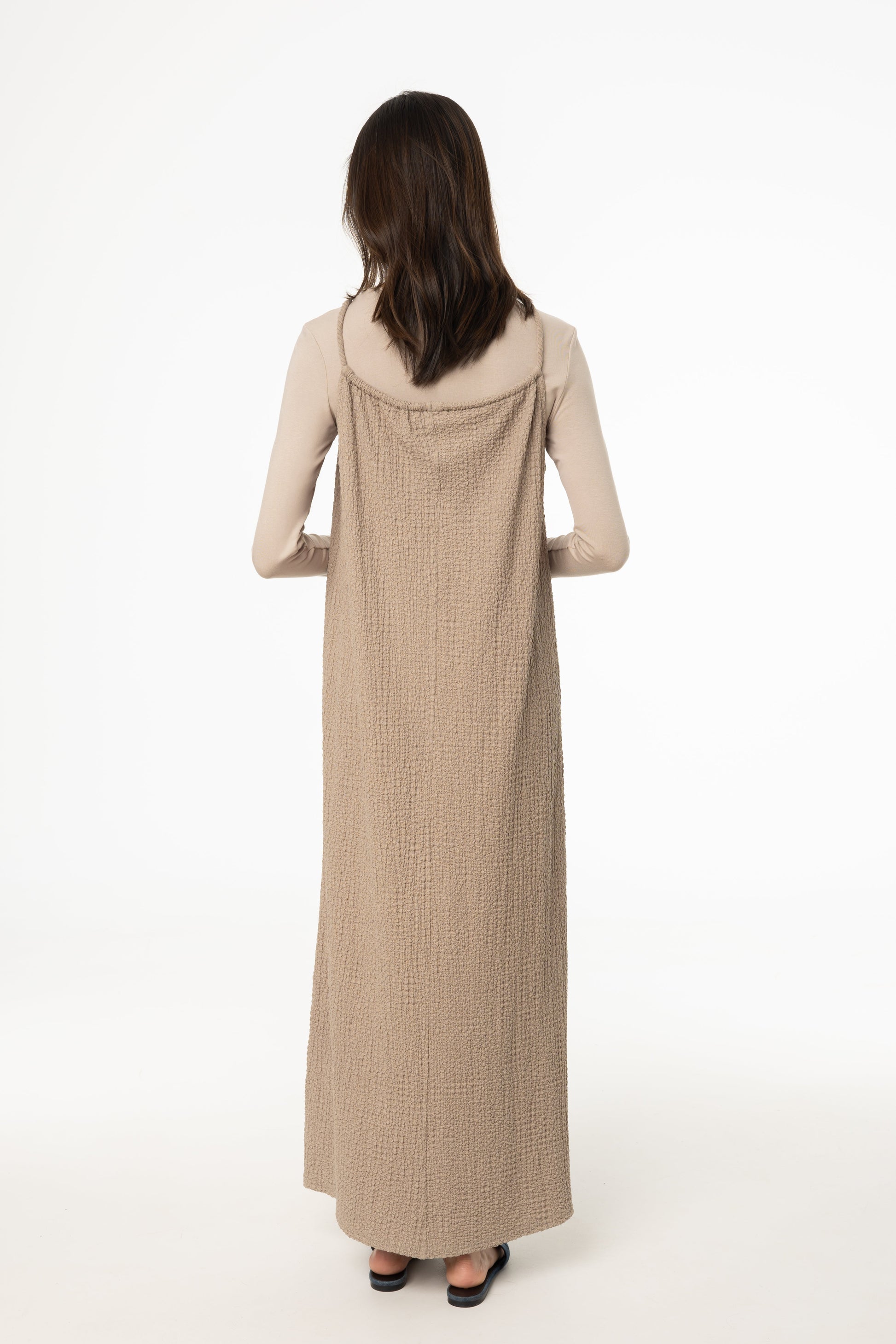 Effortlessly chic and breezy, the Smocked Rope Jumper is your go-to piece for warm-weather elegance. Crafted from airy gauze fabric, this maxi-length jumper features a beautifully smocked bodice and delicate rope straps for a touch of effortless charm. The adjustable ruched collar allows for a customizable fit, ensuring both comfort and style. Whether layered or worn on its own, this versatile piece is perfect for sun-soaked days and dreamy evenings alike