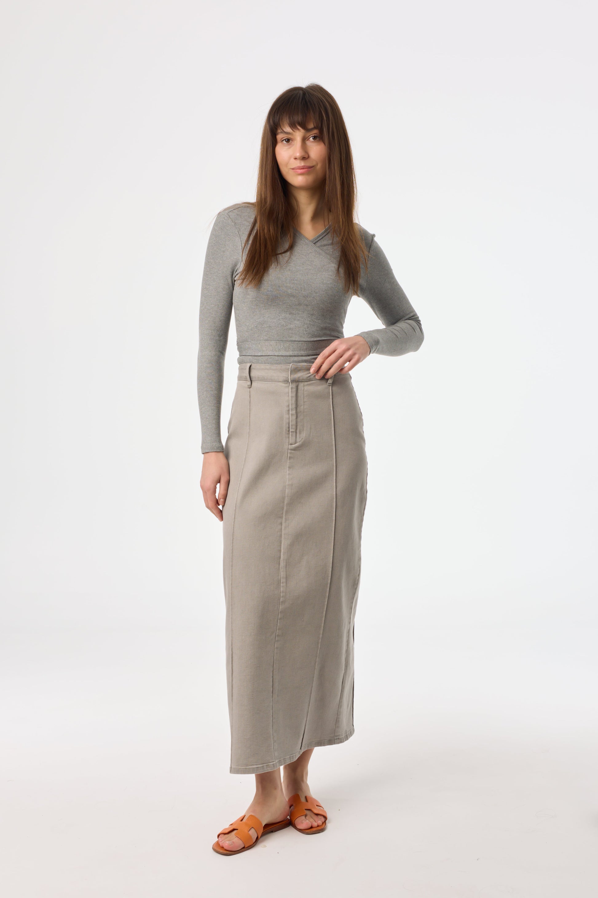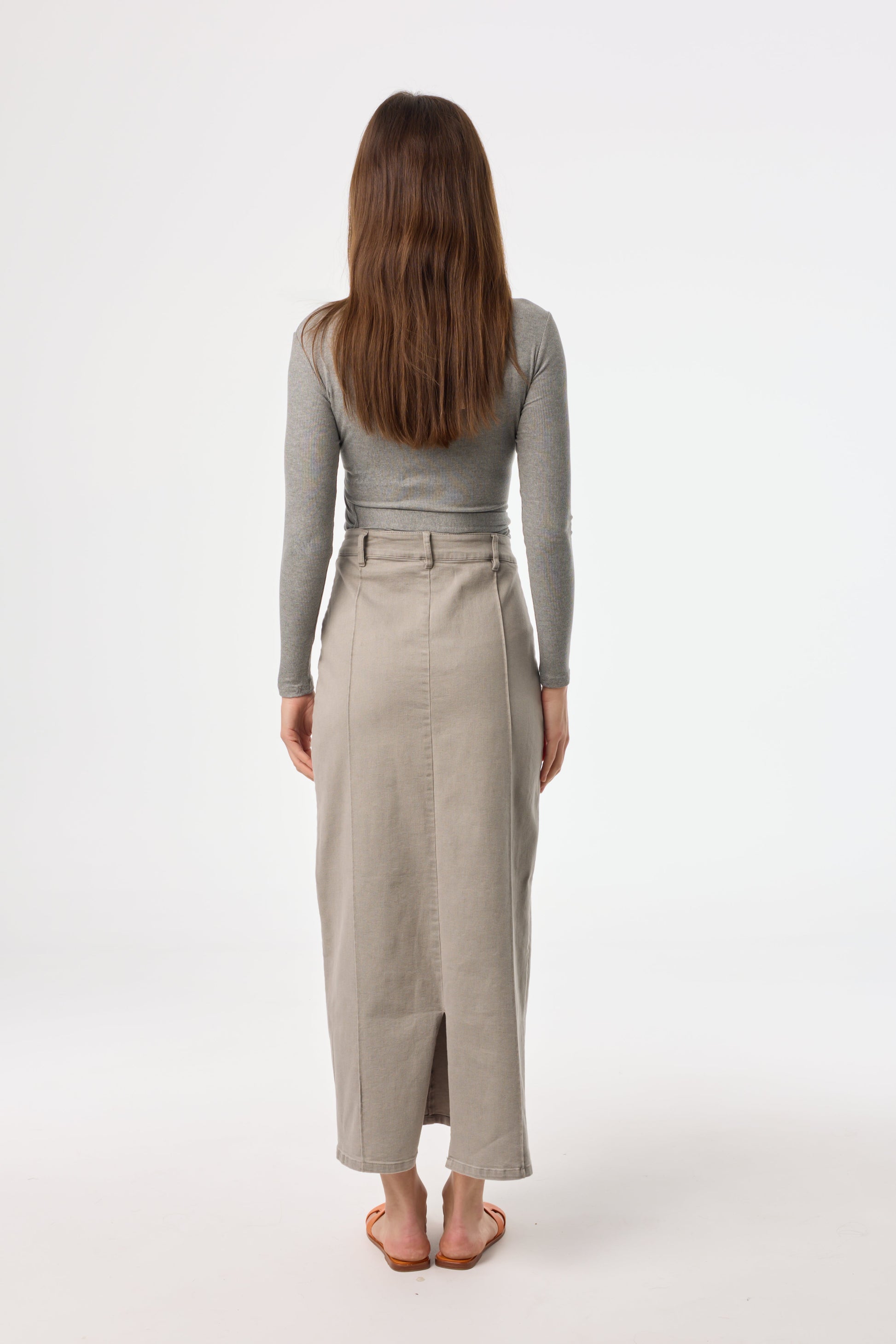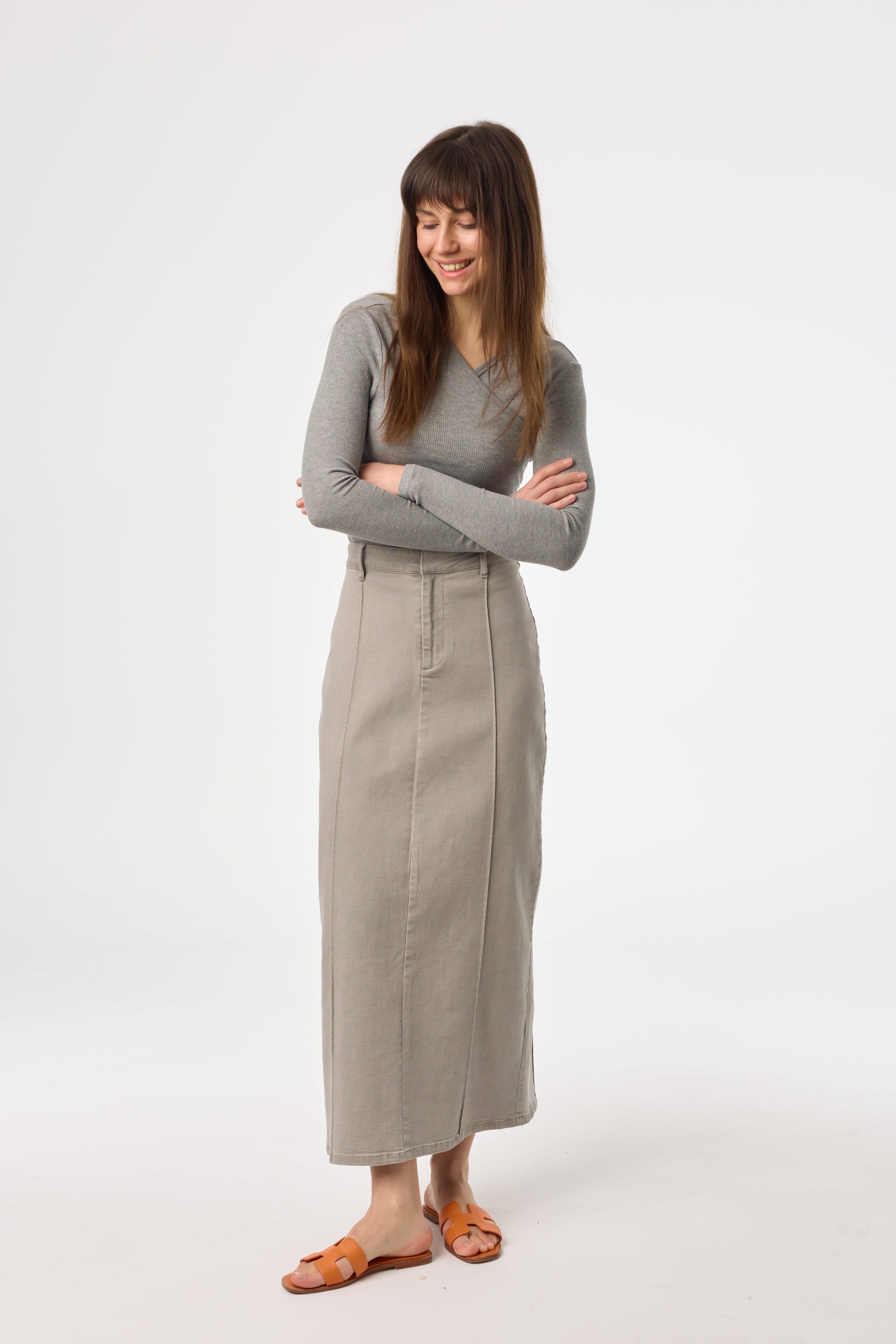 Elevate your style with our stylish Pencil Denim Skirt. Featuring a sleek and modest fit, this skirt offers a discreet slit at the back for comfort and movement, making it easy to style for a more casual day or a more polished look for special occasions.