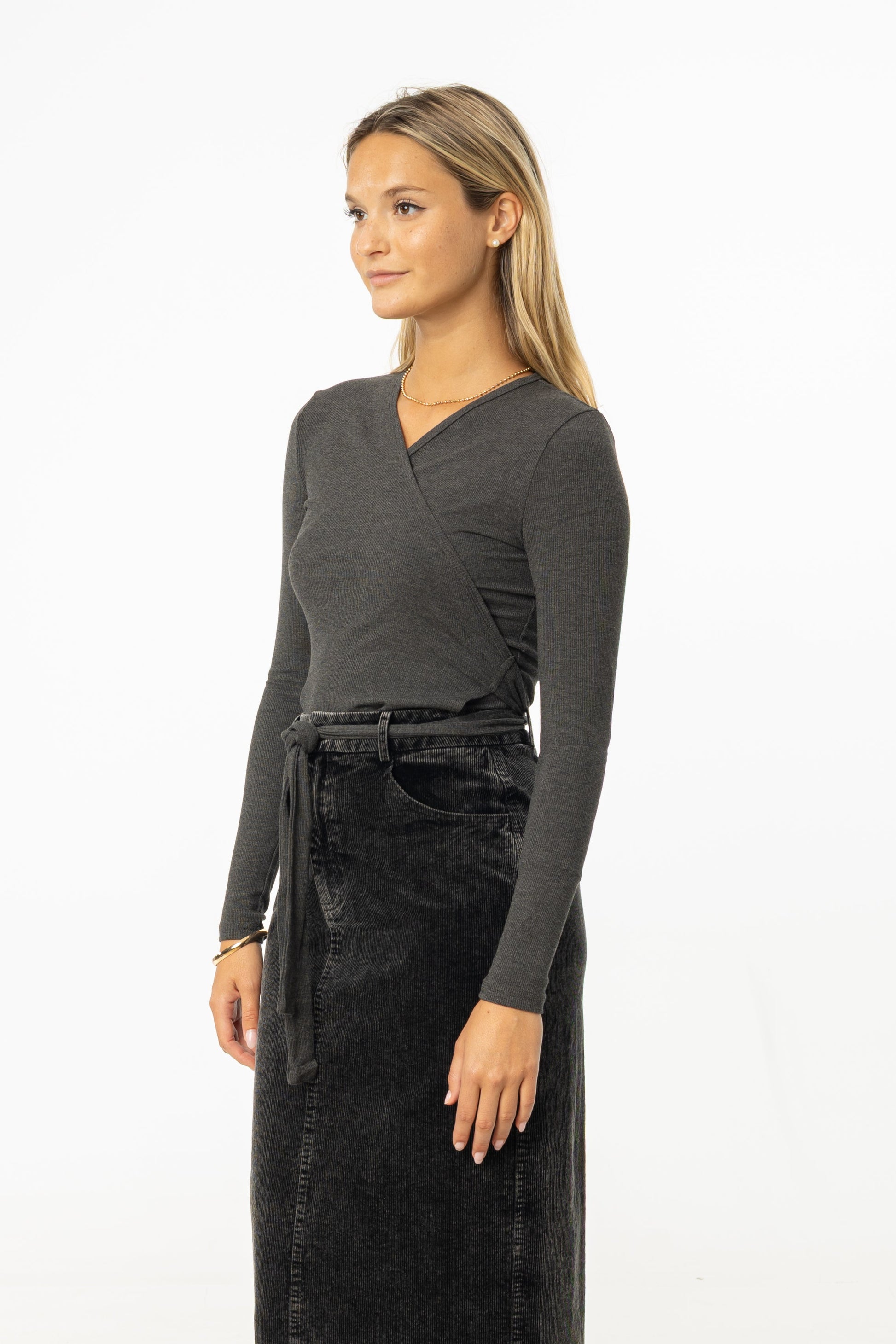 Our new and improved Wrap Top! The perfect combination of our best-sellers, Tie Wrap Tee & Wrap Top 2.0, this ribbed long sleeve top provides the slim-fitting illusion with a faux wrap and tie waist. Pair with any of our bottoms for the ultimate sophisticated fantasy!