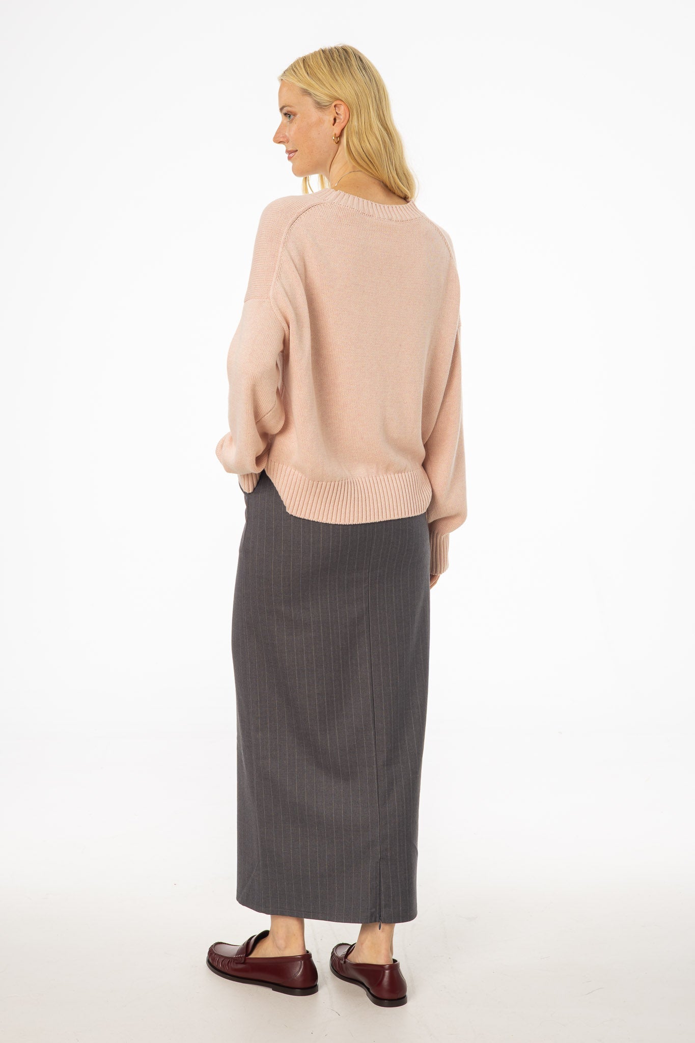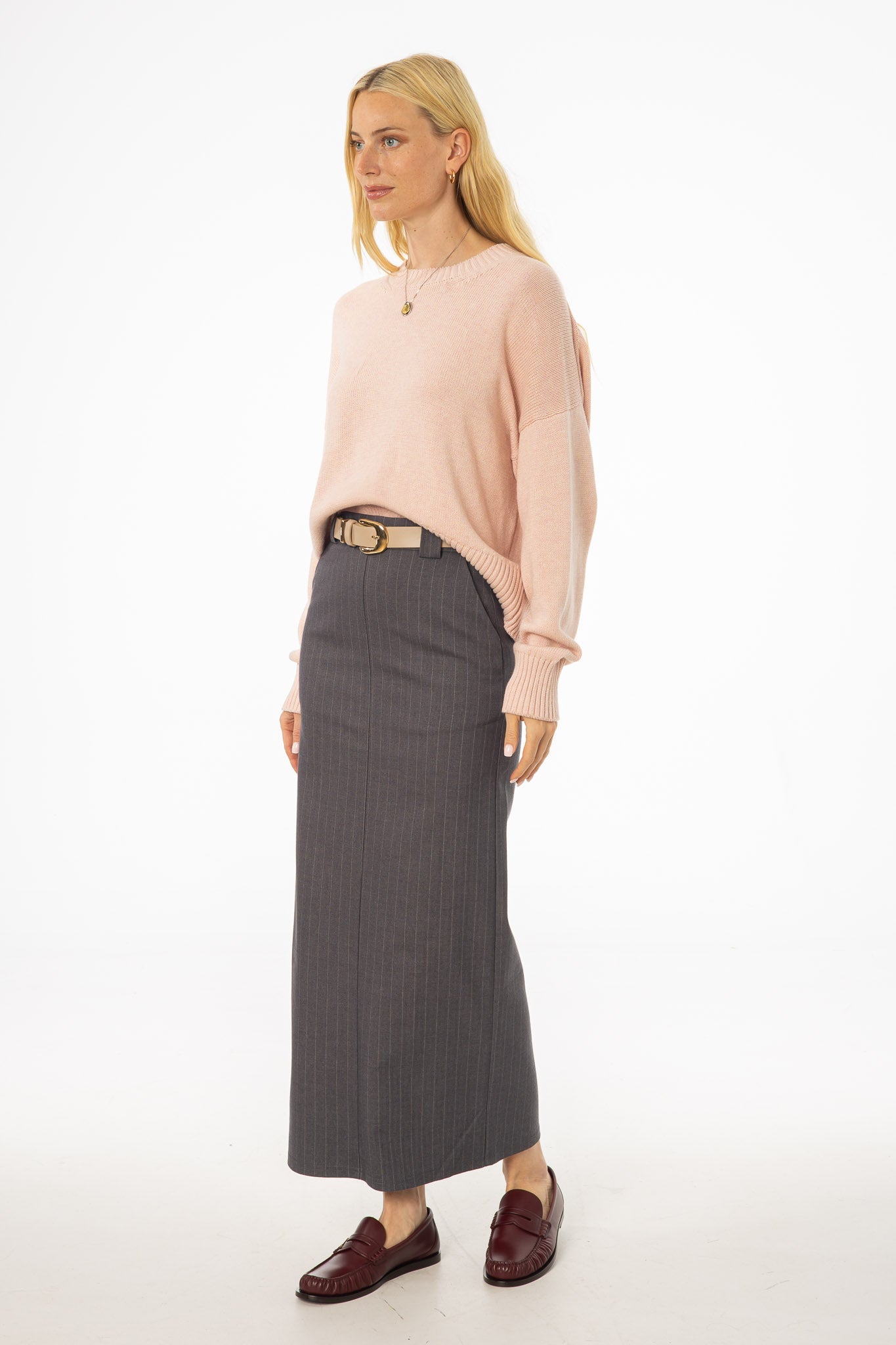 A skirt that pulls double duty. Pinstripes give it polish, while the easy shape keeps it wearable all day. Pair with sneakers for errands or loafers for office hours. The fabric moves with you, never stiff or overdone. Sharp, simple, and always ready