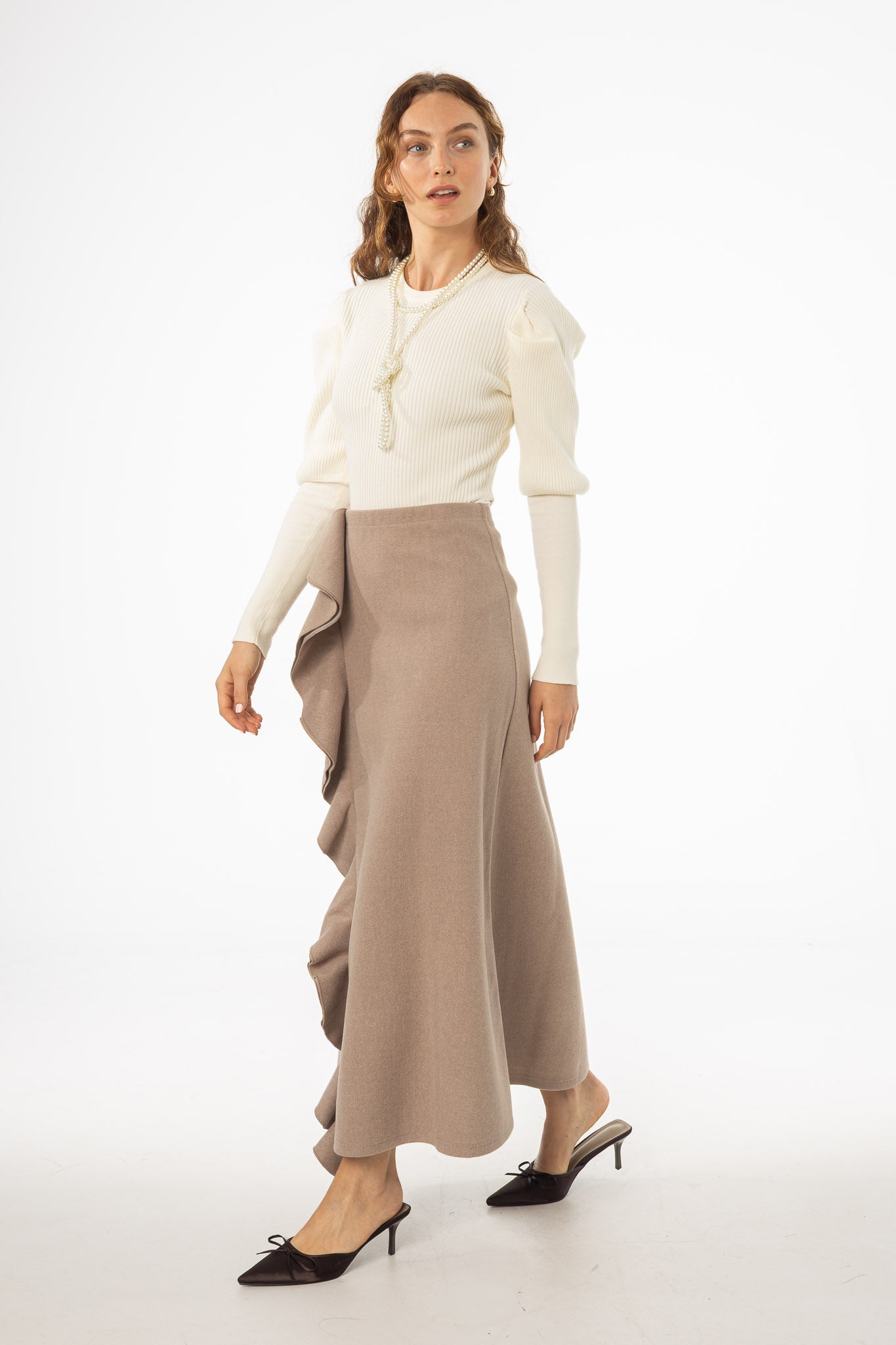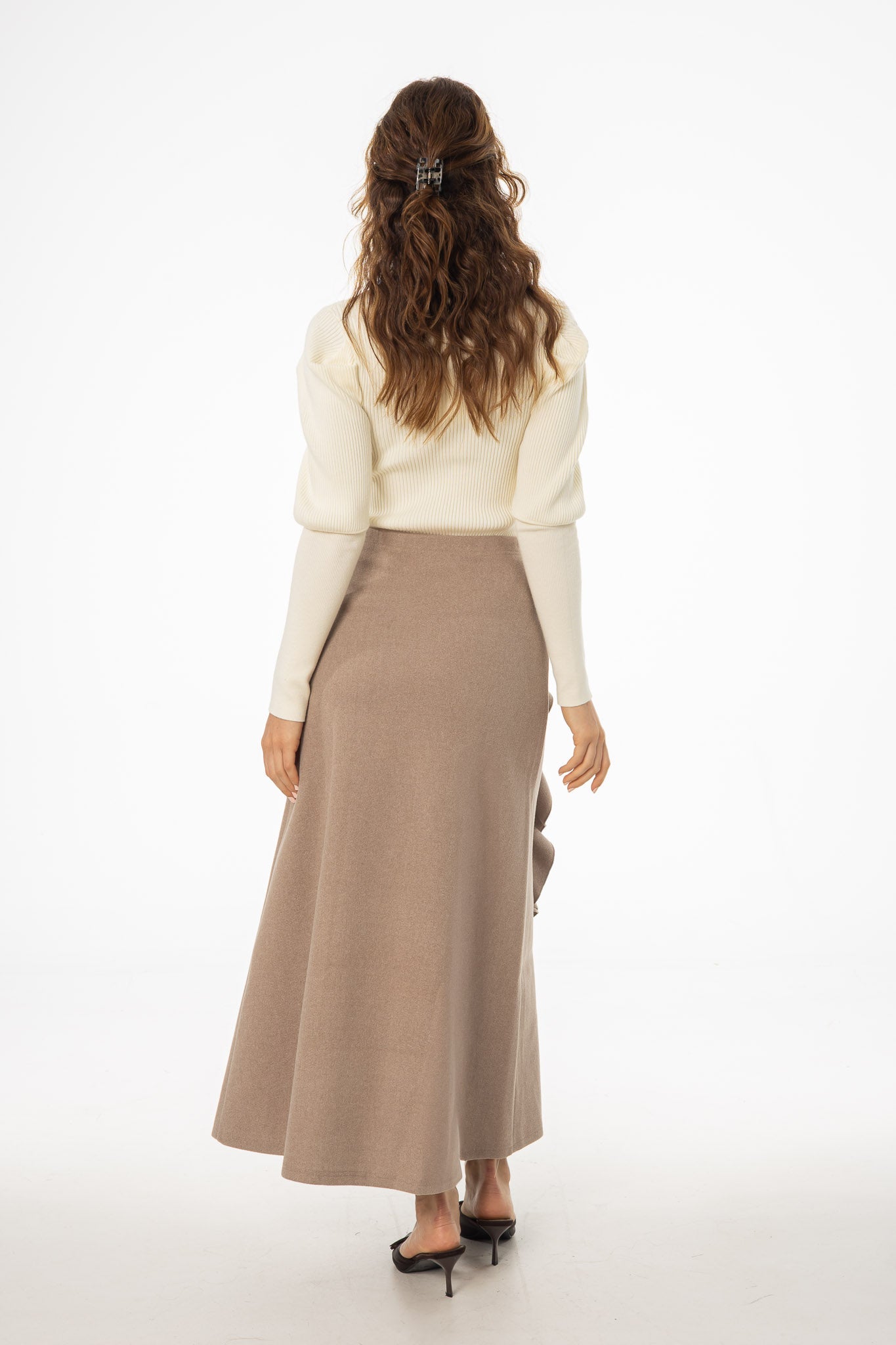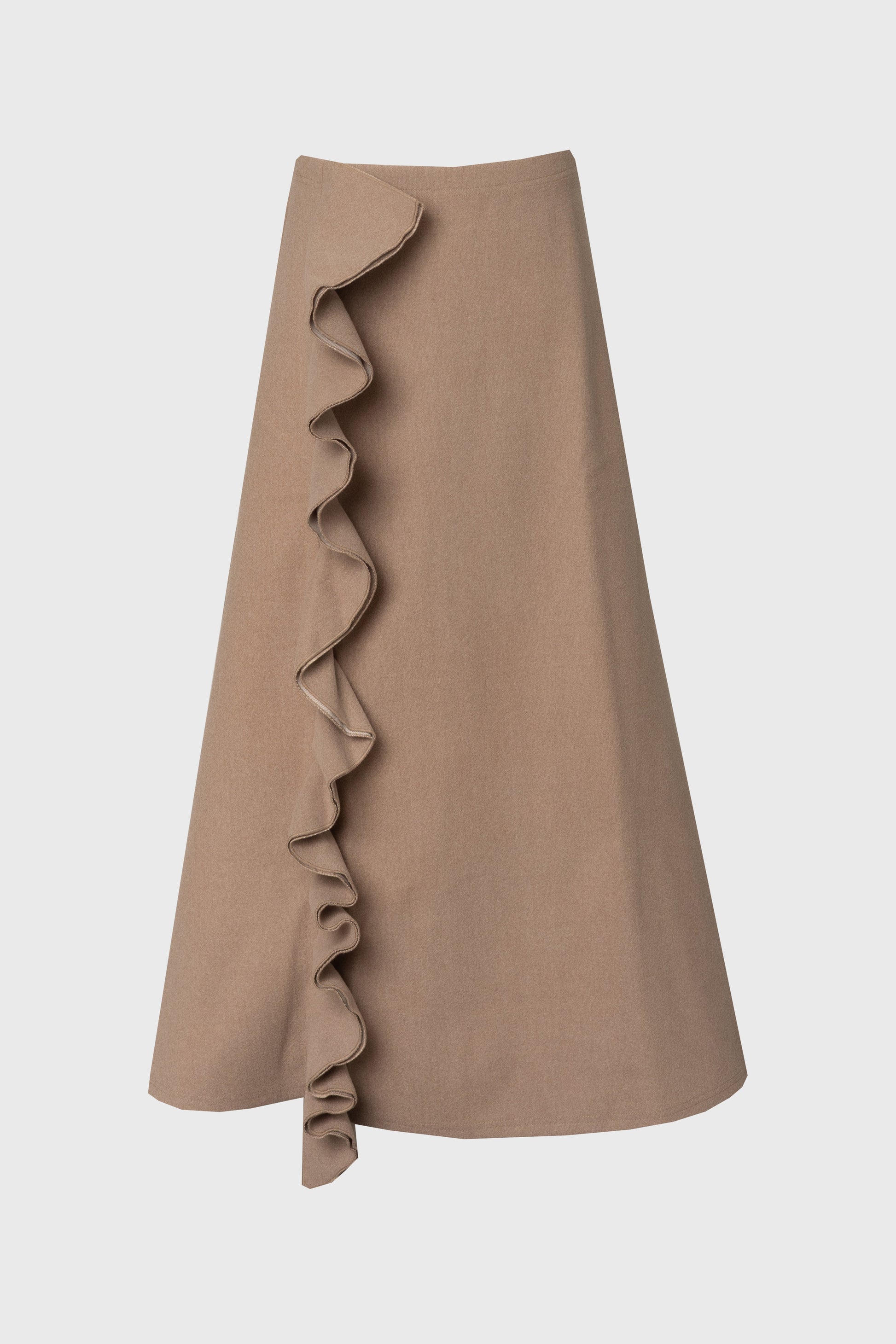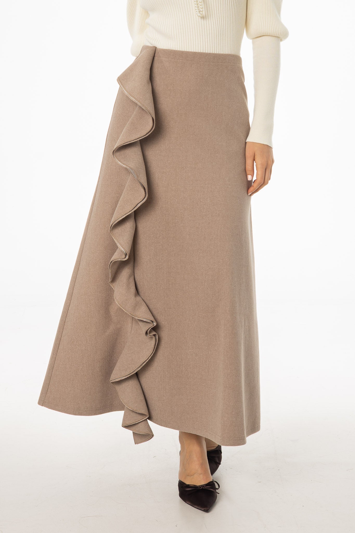 Taupe Ruffle Wool Maxi Skirt