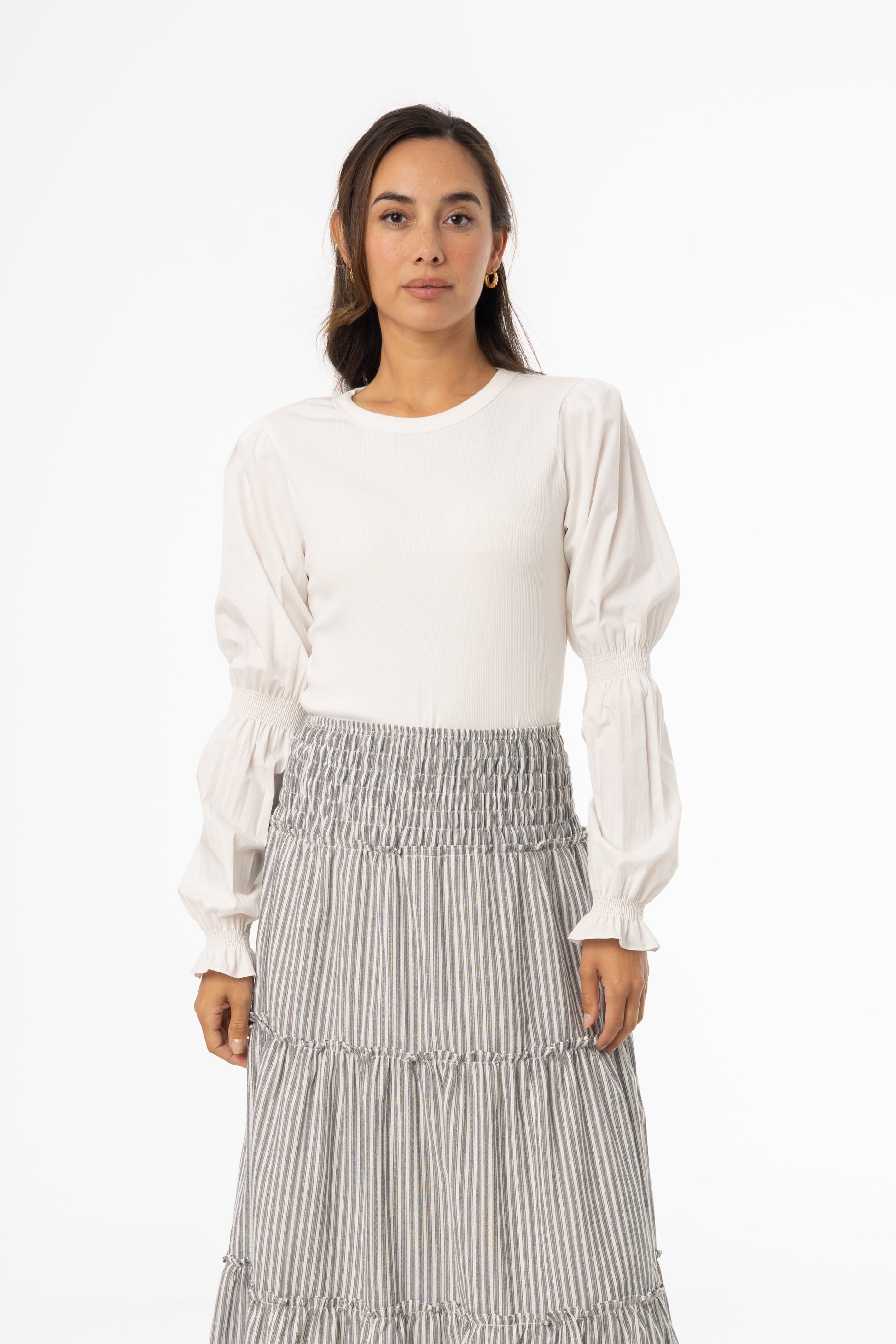 Not your average T-shirt. The contrast sleeves and gathered details give this one a playful twist, making even the simplest outfit feel put together. Heading to a weekend market? Pair it with a denim skirt. Running errands before meeting friends? Tuck it into a maxi skirt. Whatever the plan, this top brings just the right amount of style without trying too hard.
